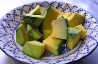 まずは、南瓜を半分の半分に切り割き、一口大に切ります。水で洗ってふきんで拭いておきます。