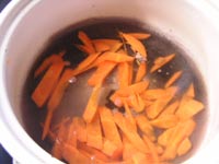 鍋に水を入れ、短冊切りにした人参を煮込みます。その後、千切りにしたタマネギを入れて一緒に煮込みます。そして、南瓜の素揚げを入れ、ケチャップ・醤油・ソース・酢・砂糖・みりんを入れて味付けします。
